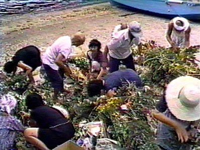 【1】「しょうらいさん」の舟の骨格は出来上がり、花束を手分けして作ります。