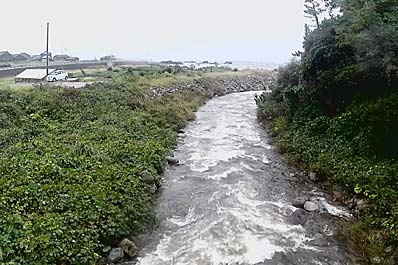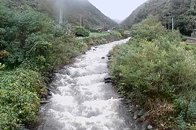 | 【97】(戸地川 上流側) 「御太鼓」の撮影に急いで戻ります。途中の戸地川は増水しています。 太鼓は雨の中、集落中心地から担いでゲンタロ家まで行くのはリスクが高すぎます。 |
