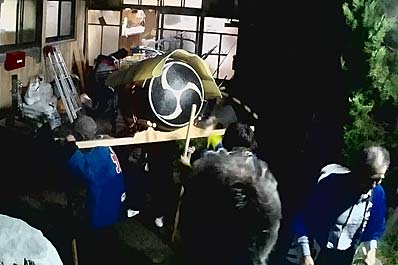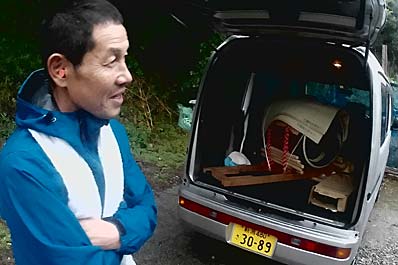 | 【99】【100】やっとゲンタロウ家に太鼓到着。 太鼓は湿気、水濡れに大変弱いリスクがあります。 雨対策で、祭り歴史初めての徹さん発案で軽ワゴン車で移動してきました。 |