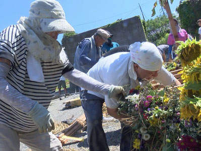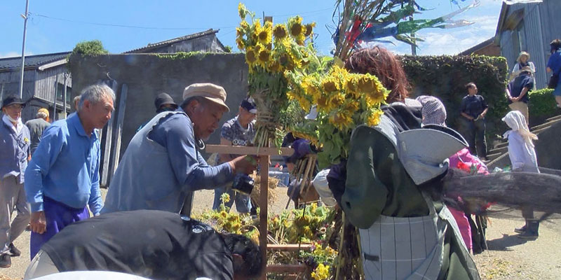 【27】全体画像です。ミヨシ(先端)でひまわりをくくっているいずみさん、その周りに保さん、準一さん、健作さん、真佐夫さん、新一郎さん、直人さん、仁王立ちの忠文さん 花束つくりはピンクシャツの由利子さん、花を持っているのは聡美さん・・ |