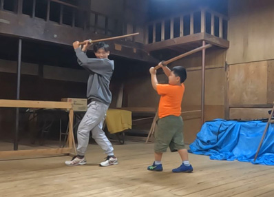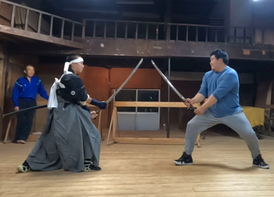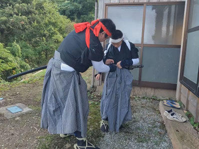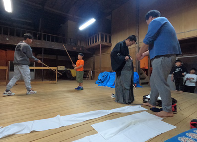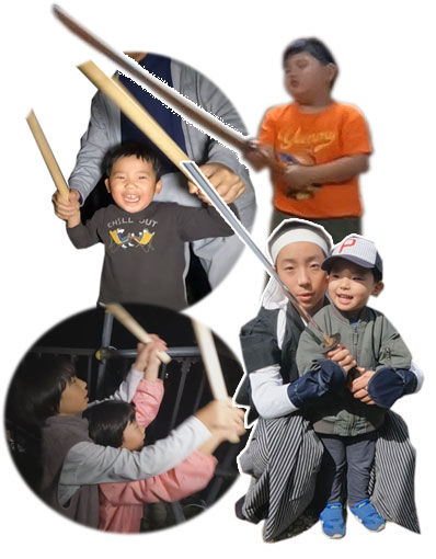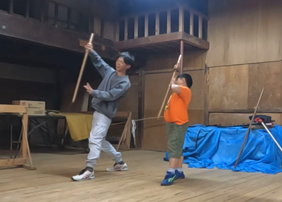 | 【7】【8】「白刃」の次期担い手「龍城」君(小2)を指導 、ジンゴロウ家の伝統を守ります。 隆則さん→博斗さん→隆利さん→隆秀さん→隆元さん そして龍城君 隆利おじさんから厳しい指導を受けます。期待してますよ〜! |