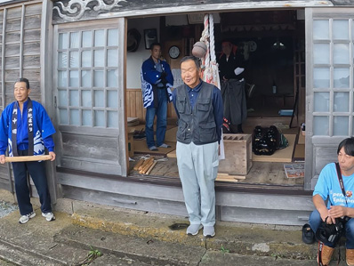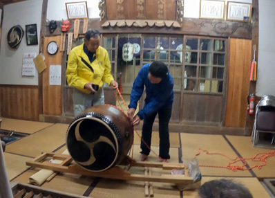 | 【5】ジンベイ家を購入して戸地生活にどっぷりなまっている松本さん夫人 参加2回目もやる気満々で〜す! | 【6】総代のジンジュロウの健作さん、今年、農区長のゲンネム家の徹さんが本番使用の太鼓をセットします |