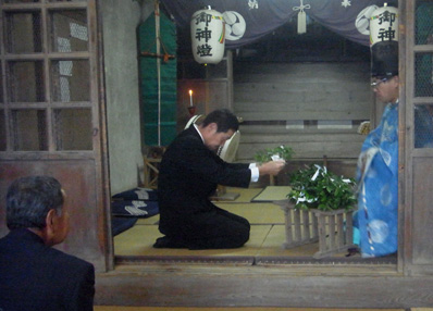 熊野神社での神事(10月18日13:00〜) 祭り前日に集落役員等が列席し、五穀豊穣、集落安穏を願って熊野神社の「神事」が行われました。 |