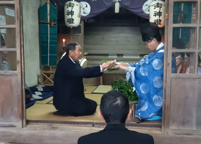| 【17】玉串の奉奠 一番は農区長のゲンネム家の徹さん | 【18】二番は集落総代のジンジュロウ家の健作さん その後、忠文さん、幸雄さん、直人さんが続きます。 |