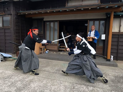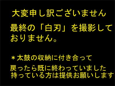 白刃 *演技者の確保が出来なくて半棒、小薙刀、大薙刀、陣鎌、大棒の中で、 全54の組太刀があるがその中の「山河」「かるぎ」「下段」のみで門付けを実施した 三宝 山本忠文(ヨシベイ) 切り 金津富士夫(ジンタロウ) 野崎健司(ジンジュウロウ) 越前隆秀(ジンゴロウ) 受け 大坪準一(インキョ) 和田直哉(キンジュウロウ) 越前隆元(ジンゴロウ) 大坪刀我(サンシロウ) |