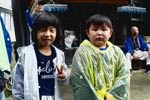 | 大雨の中、祭りが開催されました。太鼓を濡れから守るためにビーチパラソルを利用するなど・・大変でした。 |
